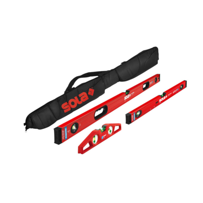 Sola Big Red Classic Magnetic Set delivers unmatched precision with patented SOLA FOCUS vials, providing faster, more accurate readings. This set includes 48", 24" and 10" levels, along with a durable 48" carrying bag for easy transport. Break-resistant acrylic vials with +60% magnification ensure clarity, while optimized luminous backing enhances readability in dim light. Built for professionals, the levels feature shock-absorbing end caps and highest measuring accuracy in both standard and inverted positions.