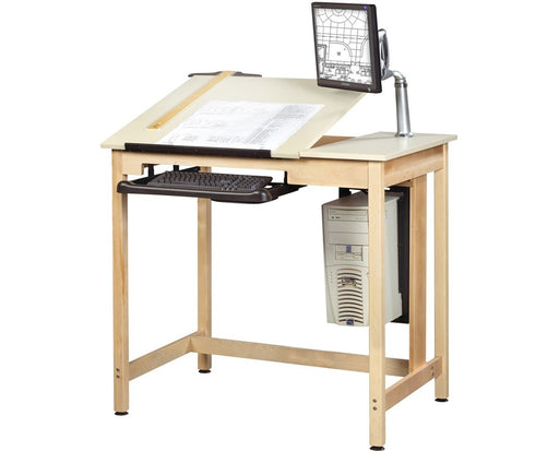 Professional Drafting Table Choices: Drafting tables come in a wide variety of sizes, with table tops as small as 18” x 30” or as large as 37” x 84” and also have different ranges of tilt. For drafting table bases, you can choose wood, steel, or solid oak in different finishes. Drawing board tabletops can be made of wood, glass, or melamine in different styles and colors. Some drawing tables feature storage options, such as locking tool drawers and shallow reference drawers. Some drafting tables even have space for a CPU and flat-screen monitor, or storage compartments for portable drawing boards.