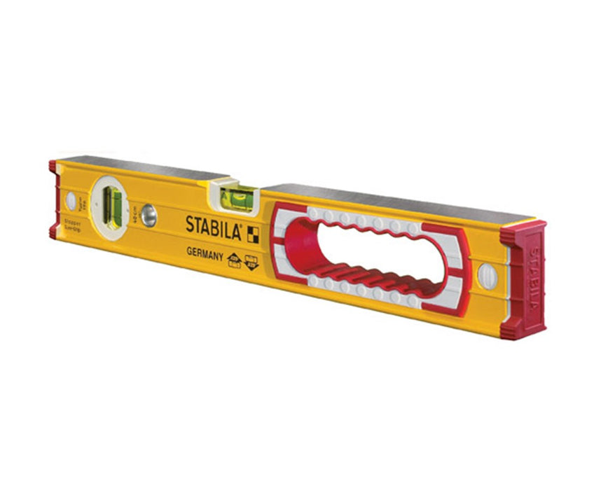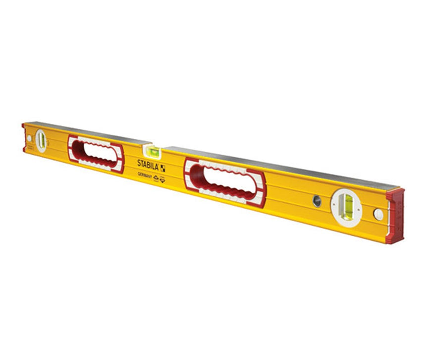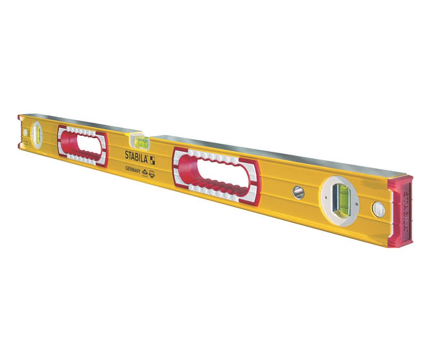 This Stabila box level is equipped with an open (16-inch to 48-inch models) or double-bridged (58-inch to 96-inch models) center vial and two plumb (except 16-inch model) vials that allow easy reading. These vials are constructed of acrylic glass and are epoxy-locked into the frame to resist leaking, fogging, or breaking ensuring long-term reliability without re-calibration needed. With its rubberized hand holes (16-inch model has only one), this level enables easy handling and comfortable grip.