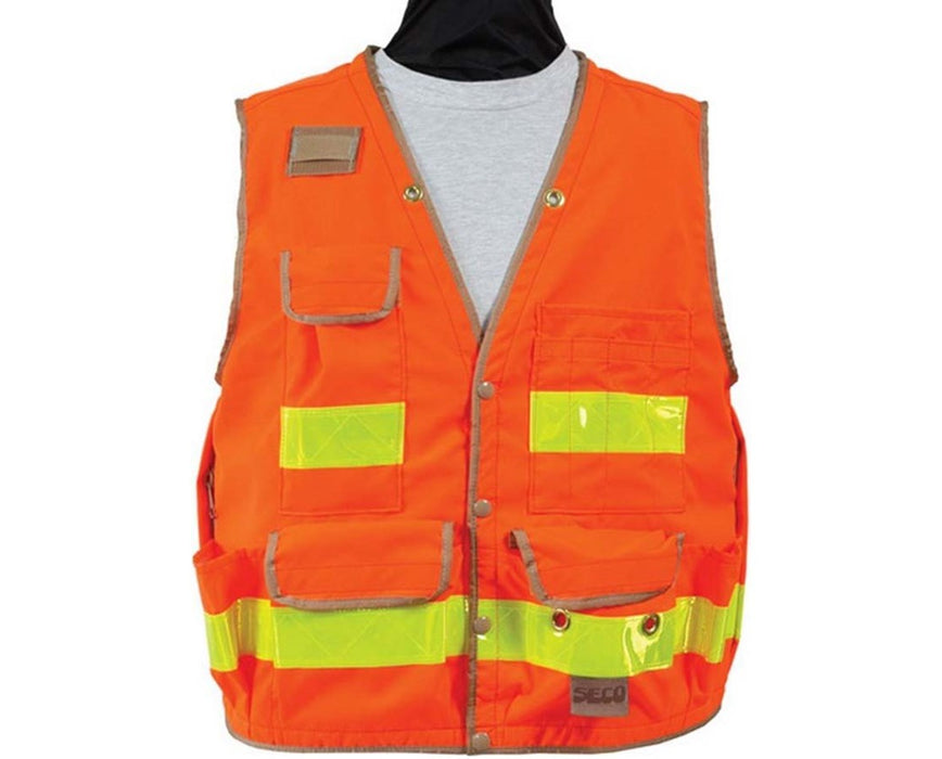 The Seco 8068-Series Class 2 Lightweight Safety Utility Vest offers visibility and safety on the job site. It is designed to comply with DOT MUTCD and ANSI/ISEA 107-2004 Class 2 standards for high-visibility safety apparel. The Seco 8068-Series features stripes of reflective tapes that are two inches wide, a large adjustable backpack pocket, and multiple exterior and interior pockets.