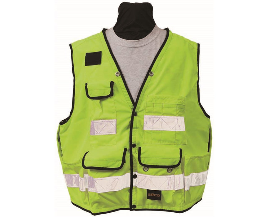 This Seco lightweight safety vest is constructed of 100% Polyester for softness, comfort, superior strength, and abrasion resistance. It includes a mic clip and its pockets have sturdy snap fasteners. This durable Seco utility vest comes in different sizes from Small to Jumbo in highly-visible colors.