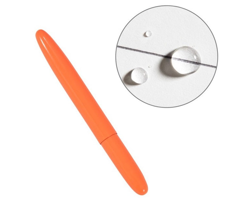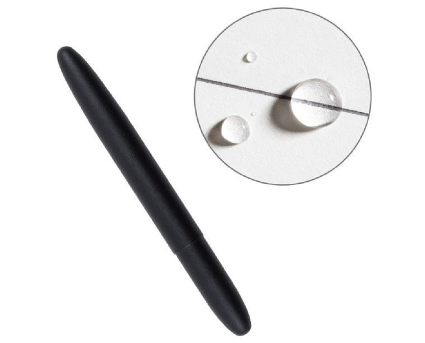 Rite in the Rain All-Weather Metal Bullet Pen is the perfect complement to the water-resistant Rite in the Rain papers. Its specially-formulated ink will not wash away or bleed when used on Rite in the Rain paper. The pen has a powder-coated brass barrel in bullet-shaped design that makes it hold up against wear and tear. It encases a pressurized ink cartridge that enables the pen to write at any angle. The All-Weather Metal Bullet Pen will function in places with temperature from -30F to 250F, and can even write underwater (up to 35 ft). The pen writes with black ink and has a .9 point for better visibility. When all used up, the pen's ink cartridge may be replaced with refills. The Rite in the Rain All-Weather Metal Bullet Pen is sure to become a favorite writing tool in any field worker's kit with its sleek look and reliable writing performance.