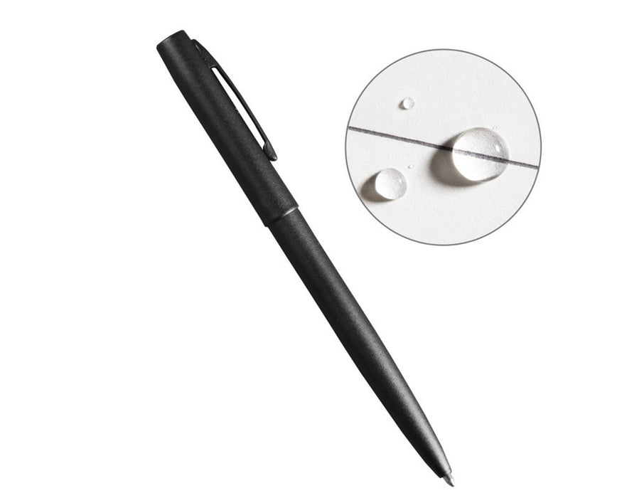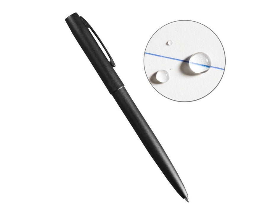The Rite in the Rain (RITR) All-Weather Metal Pens write through moist or wet surface in the harshest of conditions, making it the perfect partner for Rite in the Rain papers. It has 2 options for ink color, black and blue. Its pressurized ink cartridge makes the All-Weather Metal Pen write at any angle, even when upside down. The pen barrel is made from powder-coated brass and can resist scratches from regular wear and tear. This All-Weather Metal Pen can be used in environments with temperatures ranging from -30F to 250F, and can also write under water (up to 35 ft). These pens have a point of .9mm and ink cartridges may be replaced with refills.