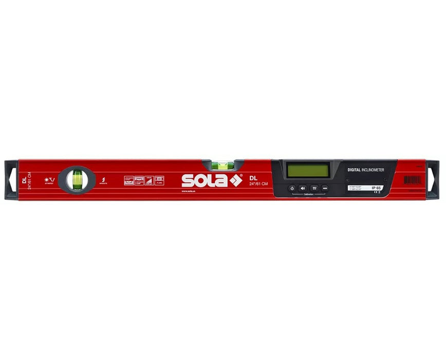 Used to measure inclination and angles, the Sola Digital Box Beam Level features an integrated electronic inclinometer module with an adjustable inclination display in °, %, in. /ft. and mm/m. A "hold" function conveniently stores measured values while an acoustic signal guide conveniently assists in measuring. A fast beeping is heard when the object is close to the desired position of inclination. This feature is beneficial, especially when the level is out of sight during adjustments. Durably made in aluminum with an 890 g/m strength and a dust and waterproof IP65 protection, this rugged level is perfect for carpenters, bricklayers, stonemasons, and other building professionals.