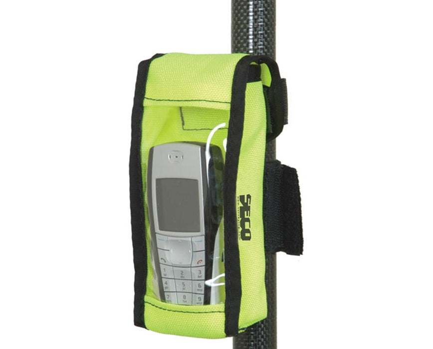 The Seco GPS Rod Cell Phone Case secures the user's cell phone to any surveying pole without slipping. The case has inner dimensions of 5 x 2.5 x 1.5 inches and comes in fluorescent yellow.