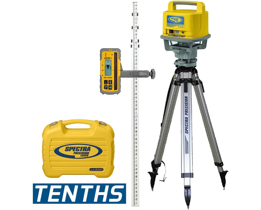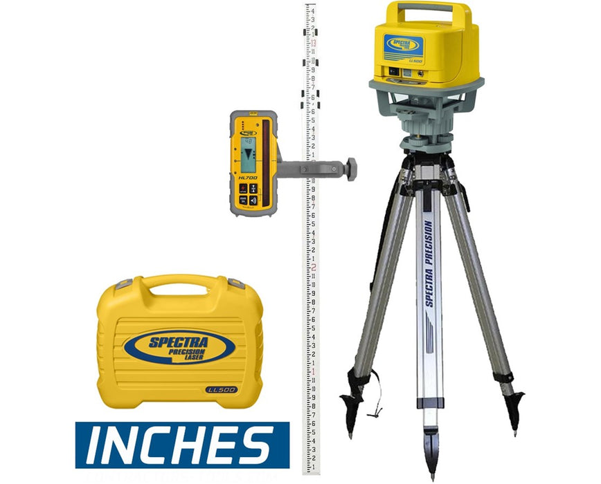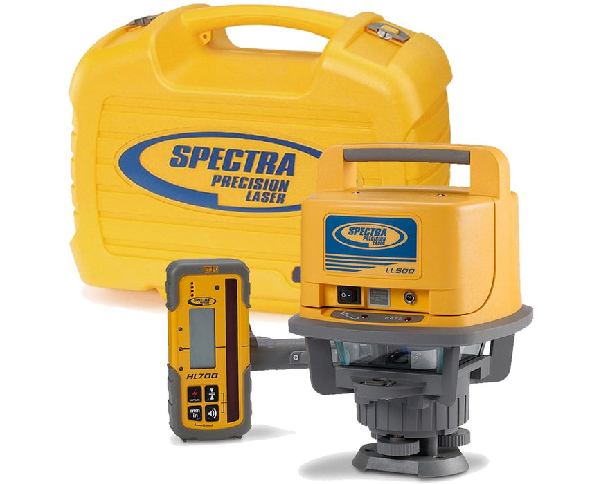 The Spectra LL500 comes with an optional HL700 receiver that locates the laser beam outdoors or in limited visibility. It features an anti-strobe sensor and a digital readout of elevation that is switchable in millimeters, centimeters, feet, inches, or fractional inch.