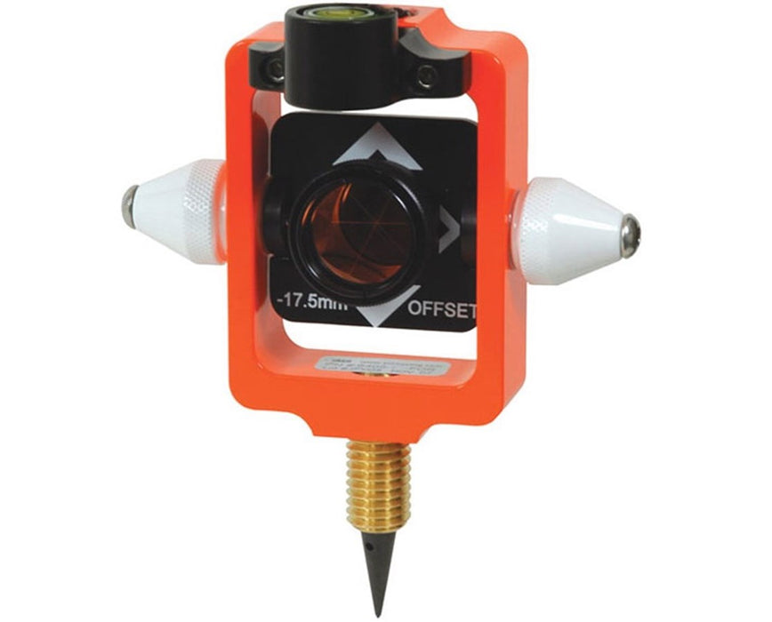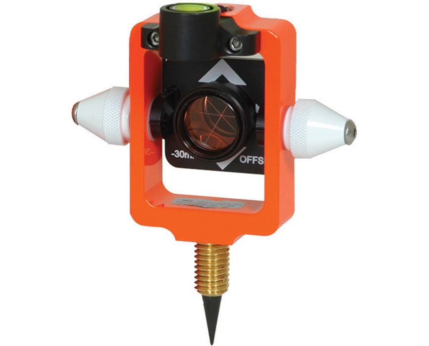 The Seco Mini Stakeout Prism with Site Cones features a 25-millimeter diameter, copper-coated mini prism attached to a target with choice of offsets (0 millimeters and -30 millimeters or -17 millimeters - nodal) held securely within a fluorescent orange holder. White site cones located on either side of the mini stakeout prism assembly improve vertical angle pointing for surveying professionals and they serve as tilting-axis lock knobs.