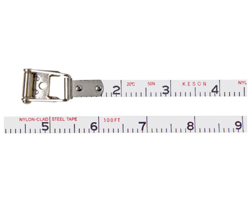 Keson nylon-coated steel tapes are constructed with a double layered .2mm nylon permanently bonded over a center core of 13mm steel. The multi-layer construction assures corrosion resistance (even to salt water) and provides at least three time the usual tape life.