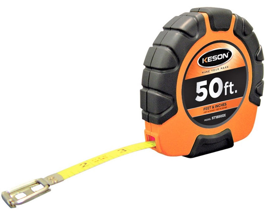 The Keson ST 3X Steel Long Tape features a 3/8-inch wide nylon coated blade that bends easily but is not affected by wind, unlike wider tapes. Also, these long tapes can slip easily into a pocket, purse, tool pouch or tool belt. For quick rewind, a 3X gearing is offered for the ST 3X version. In addition, the ST Y versions come with a belt clip.